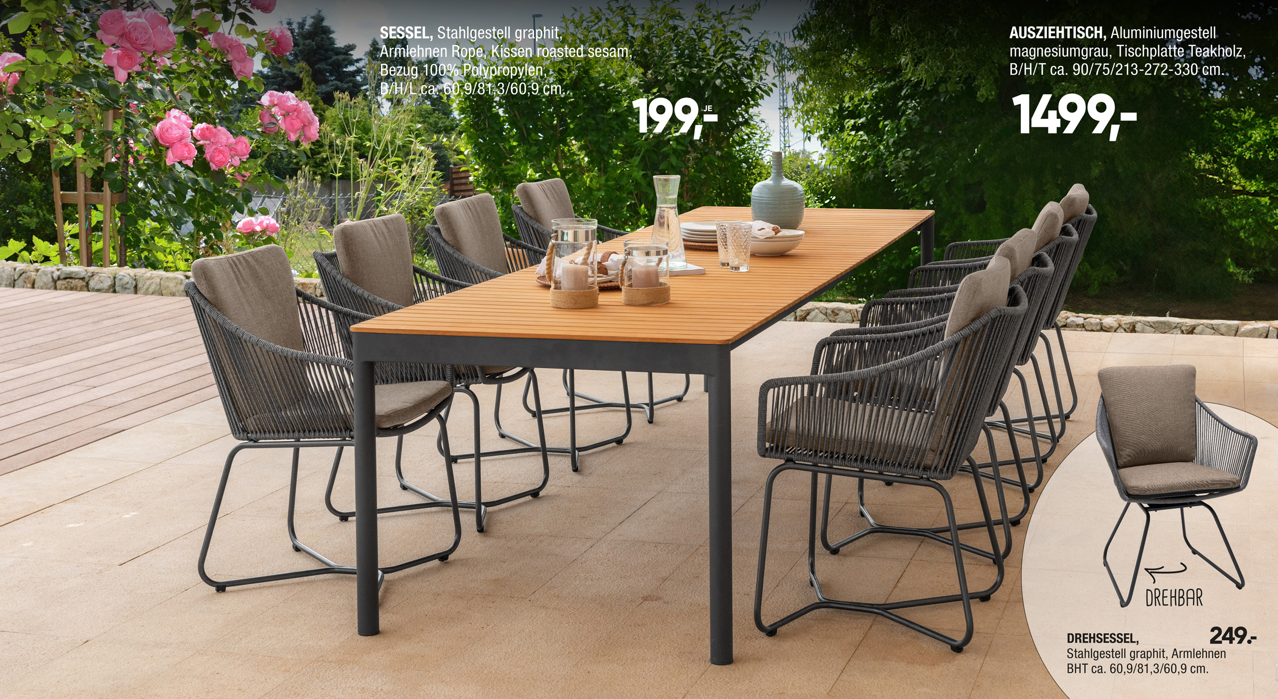 Ob gemütliche Loungemöbel, elegante Essgruppen oder wetterfeste Sonnenliegen – mit den Gartenmöbel-Trends 2025 von Möbel Graf verwandeln Sie Ihren Außenbereich in eine stilvolle Wohlfühloase. Unsere Kollektion verbindet modernes Design mit nachhaltigen Materialien wie recyceltem Holz, pulverbeschichtetem Aluminium und langlebigen Outdoor-Stoffen. Erleben Sie höchste Qualität, innovative Funktionalität und ergonomischen Sitzkomfort – perfekt für entspannte Stunden im Grünen. Entdecken Sie platzsparende Balkonmöbel, ausziehbare Gartentische für gesellige Runden oder luxuriöse Daybeds zum Relaxen. Setzen Sie auf wetterbeständige und pflegeleichte Gartenmöbel, die Wind und Wetter trotzen. Nachhaltigkeit wird dabei großgeschrieben: Viele unserer Modelle bestehen aus umweltfreundlichen, recycelbaren Materialien und überzeugen mit zeitlosem Design. Jetzt online bei Möbel Graf die neuesten Gartenmöbel-Trends entdecken und Ihr Outdoor-Wohnzimmer nach Ihren Wünschen gestalten!